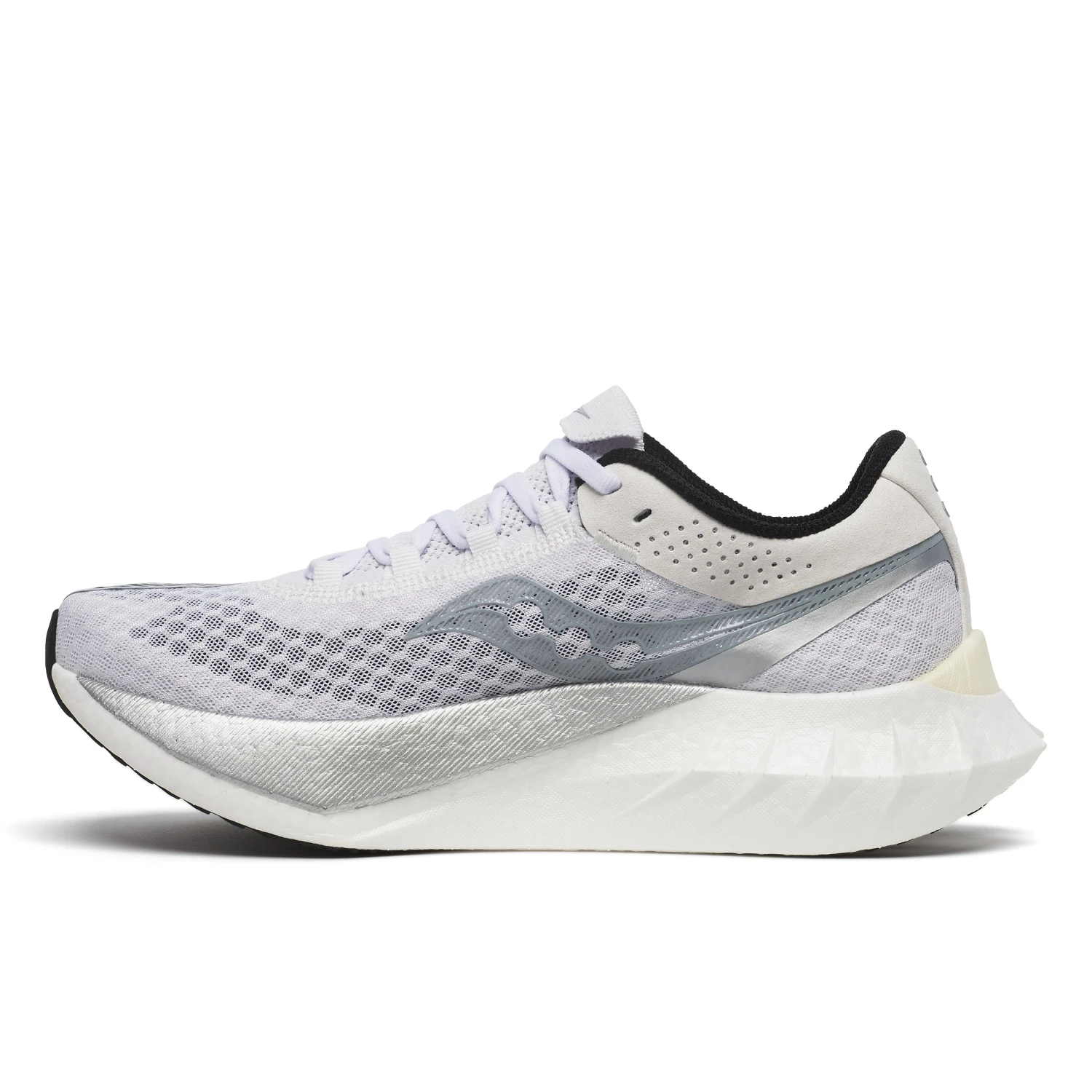 The Endorphin Pro 4 running shoe is a miraculous feat of engineering: snappy and responsive yet smooth and efficient. Something we achieved by fusing PWRRUN PB and PWRRUN HG together in the midsole – an industry first. A full carbon plate adds longitudinal stiffness and maximum metabolic efficiency. And the silky-smooth heel liner and integrated tongue system makes this marathon shoe feel like slipping on an old friend come race day.